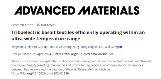 4月25日,yl23411永利集团郭隐犇副教授团队在Advanced Materials(《先进材料》)上发表了题为“Triboelectric basalt textiles efficiently operating within an ultra-wide temperature range” 的研究论文。Advanced Materials是美国WILEY集团于1988年创办的老牌旗舰期刊,是工程与计算大学科、材料与化学大领域的顶尖期刊,在国际材料领域科研界享誉盛名,最新影响因子为29.4。Advanced Materials在google公司划分的八大领域(商业经济与管理、材料与化学、工程与计算科学、健康与医药科学、人类文学与艺术、生命与地球科学、物理与数学、社会学)中,在工程与计算科学领域所有期刊中排名第一。