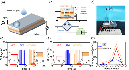 (a) 复合发电机电学性能测量方案。(b) 复合发电机为电容充电的电路图和 (c) 图像。MEG、TEG 和MEG-TEG 的(d)电压和(e) 电流输出。(f) MEG、TEG 和 MEG-TEG 的平均功率比较。