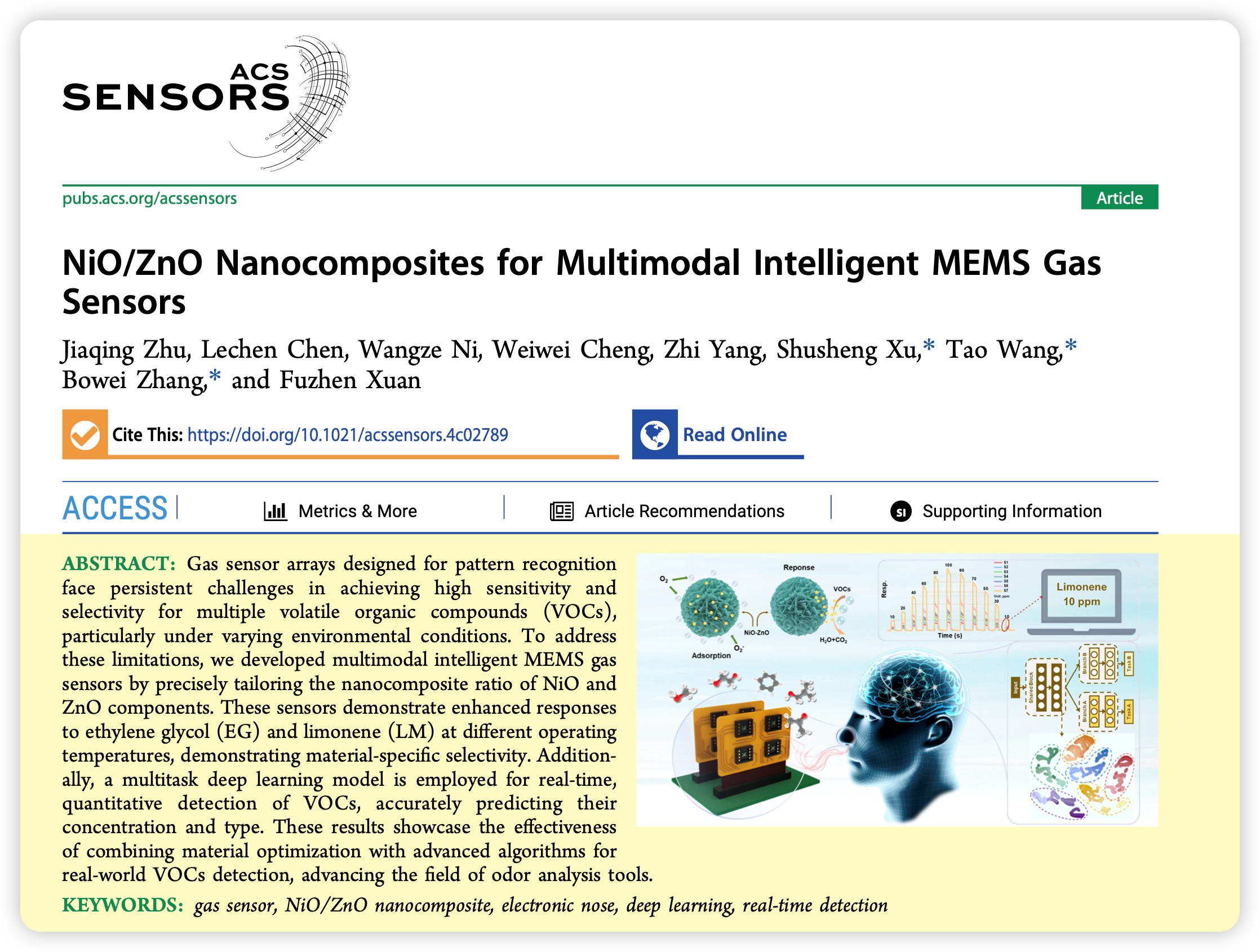 近日,yl23411永利集团徐书生博士指导硕士研究生朱佳清在传感器学科国际顶级学术期刊《ACS Sensors》(中科院一区Top,影响因子8.3)上发表了题为“NiO/ZnO Nanocomposites for Multimodal Intelligent MEMS Gas Sensors”的研究论文。徐书生为第一通讯作者,朱佳清为第一作者,华东理工大学的张博威教授和王涛副研究员为本论文的共同通讯作者。