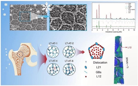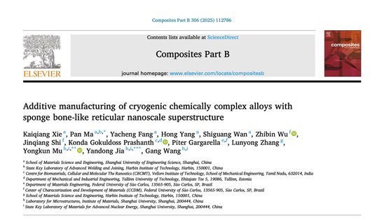 近日,yl23411永利集团马盼教授联合上海大学贾延东研究员、穆永坤副研究员指导研究生谢凯强、方亚成在中科院一区期刊《Composites Part B: Engineering》(2025,306: 112786,IF=14.2)上发表了题为“Additive manufacturing of cryogenic chemically complex alloys with sponge bone-like reticular nanoscale superstructure”的研究论文。