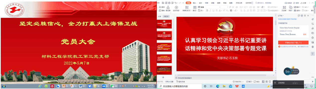 近日,材料工程公司党委各党支部采用线上会议形式开展“坚定必胜信心,全力打赢大上海保卫战”主题党日活动,认真学习领会习近平总书记重要讲话精神和党中央决策部署,认真落实市委和市教卫工作党委等工作要求。
