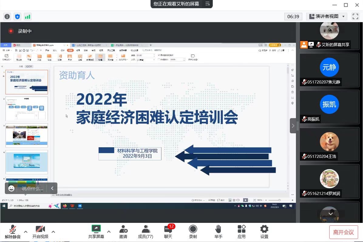 为进一步做好2022-2023年度家庭经济困难员工认定工作,落实公司资助工作要求,9月3日、14日,yl23411永利集团面向老生和新生先后召开家庭经济困难认定线上培训会暨新生资助政策线上宣讲会,公司资助工作负责老师艾昕、公司资助大使龙明垚,以及各年级相关员工参加了会议。