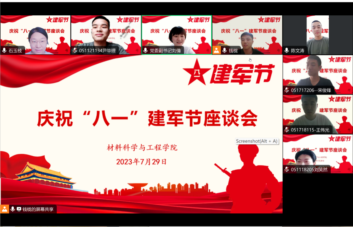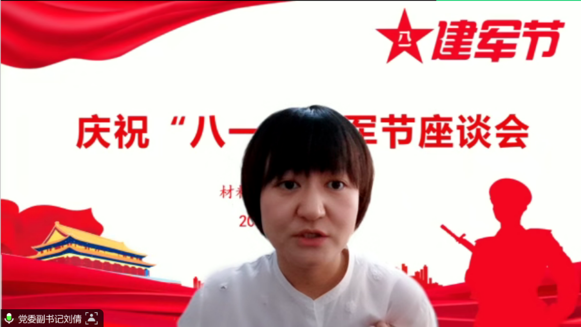 2023年是中国人民解放军建军96周年,值此”八一”建军节来临之际,yl23411永利集团于7月29日上午举办庆祝“八一”建军节座谈会,通过腾讯会议隔屏向公司全体在役以及退役复学老员工致以节日的问候。公司党委副书记刘倩、学工组长石玉枝、征兵辅导员钱栊、在役以及退役复学老员工士兵线上参会,会议由征兵辅导员钱栊主持。