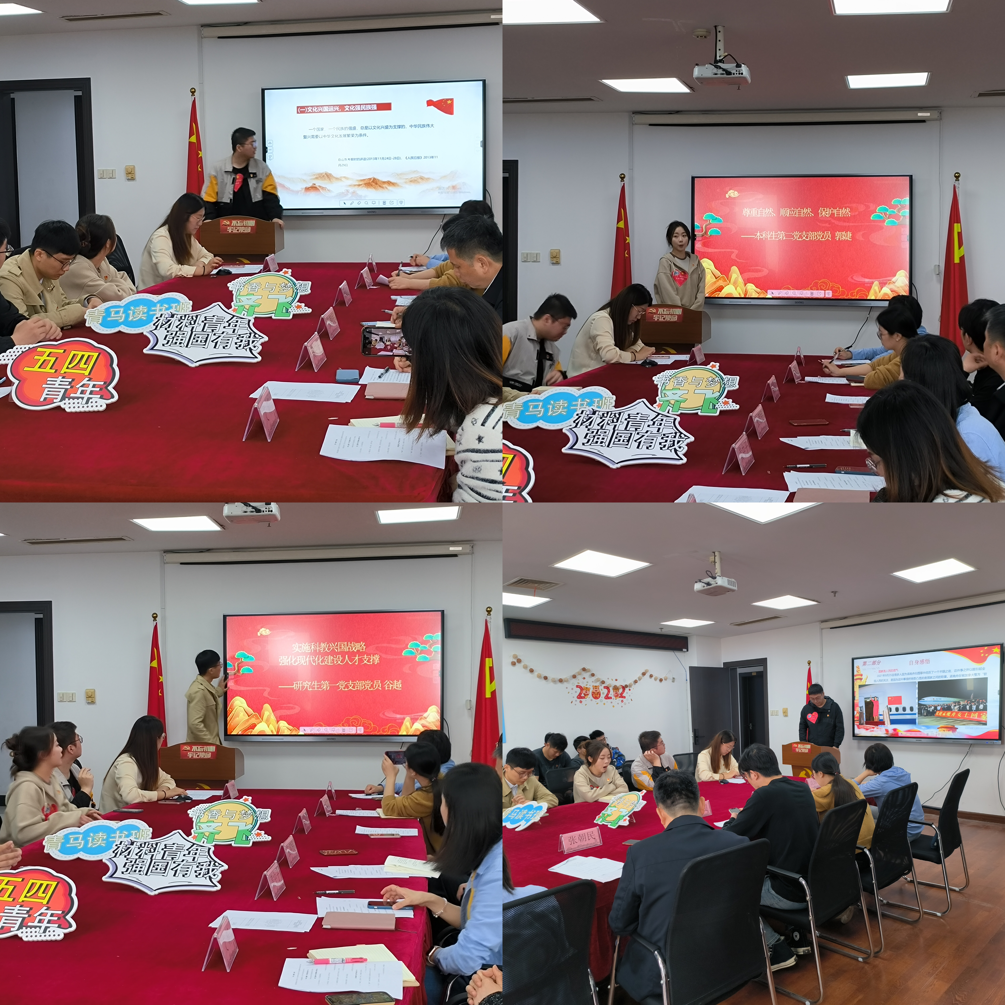 本科生第一党支部党员孙志远、本科生第二党支部党员郭婕、研究生第一党支部党员谷越、曹忠旭结合主题教育必读书目《习近平新时代中国特色社会主义专题摘编》中的内容,分别从“文化兴国运兴,文化强国运强”“尊重自然、顺应自然、保护自然”“实施科教兴国战略,强化现代建设人才支撑”“强国必须强军,军强才能国安”等主题进行分享和交流。研究生党员谷越讲到在做科研时应深入课题深处,努力挖掘新问题,遵守科研道德规范,在自己的领域努力深耕。曹忠旭在阅读强军思想内容后深有感悟:国家是人民的底气;弱国无外交;国防才是外交的后盾。